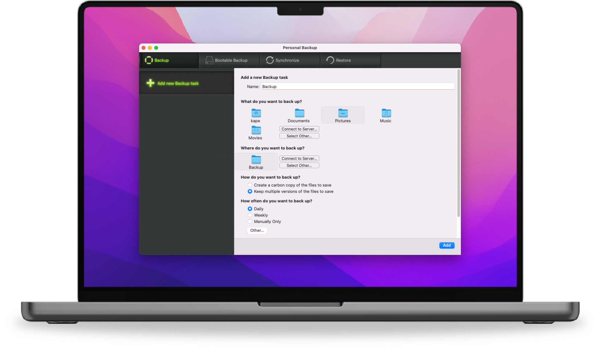 Personal Backup ofrece máxima flexibilidad; haga una copia de respaldo de lo que quiera, para lo que quiera y cuando quiera.