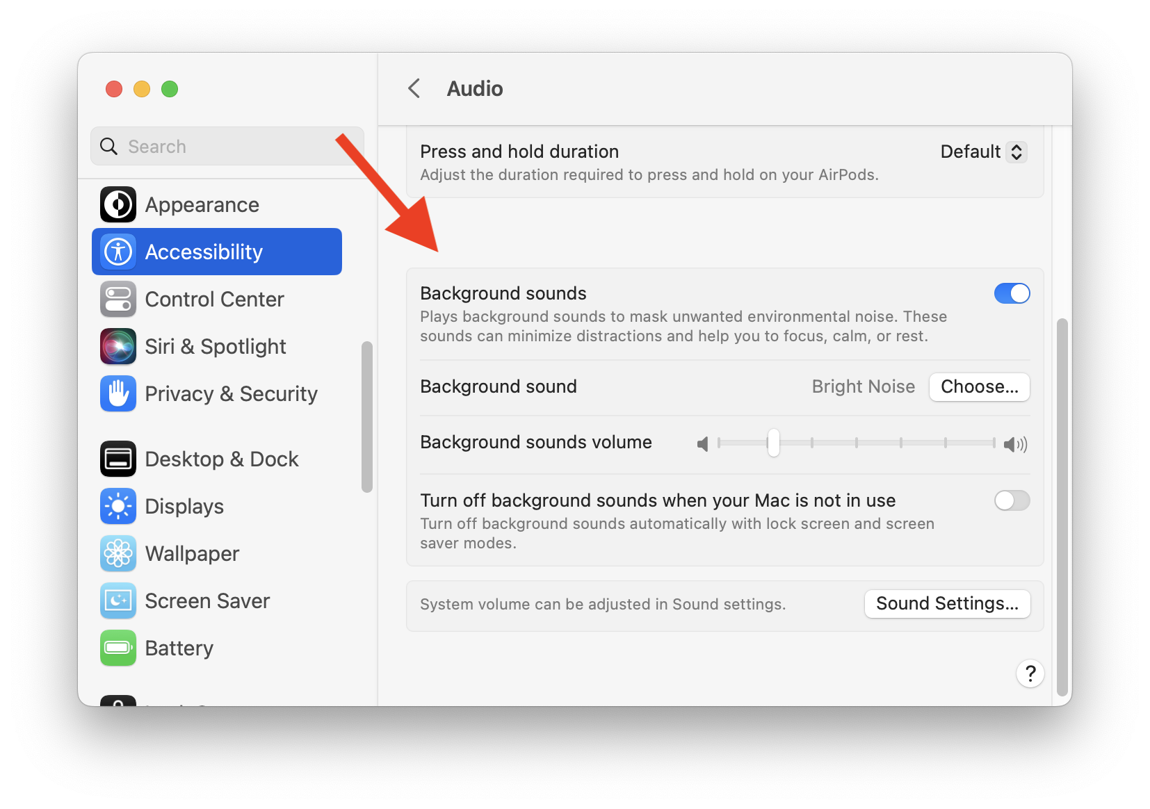 Go to System Settings > Accessibility, then, in the Hearing section, click Audio. Scroll down until you find Background Sounds. Apple says that these sounds can “help you to focus, calm, or rest.”