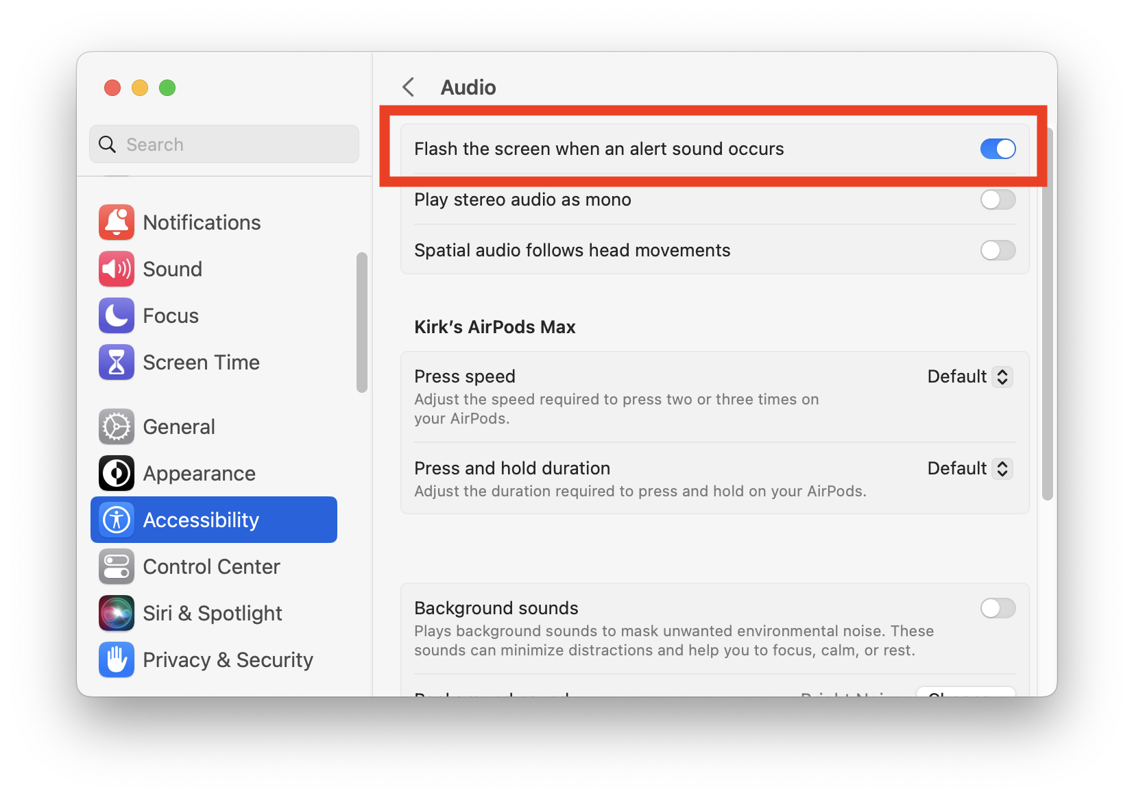 Alert sounds tell you when something isn’t working on your Mac. They’re great if you’re in a quiet environment, but if you like listening to music while you work on your Mac, or if you have muted your Mac, you may not hear them. A feature in the System Settings > Accessibility > Audio settings lets you flash the screen when an alert sound occurs.