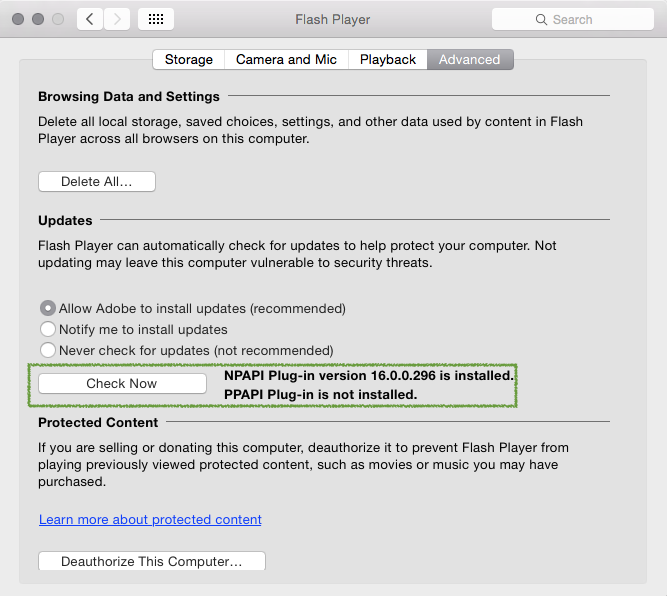 Now you should see that NPAPI plug-in version 16.0.0.296 is installed. This is the latest version of Flash Player and includes patches for both 0-day vulnerabilities (CVE-2015-0310, CVE-2015-0311) affecting earlier Flash Player versions.