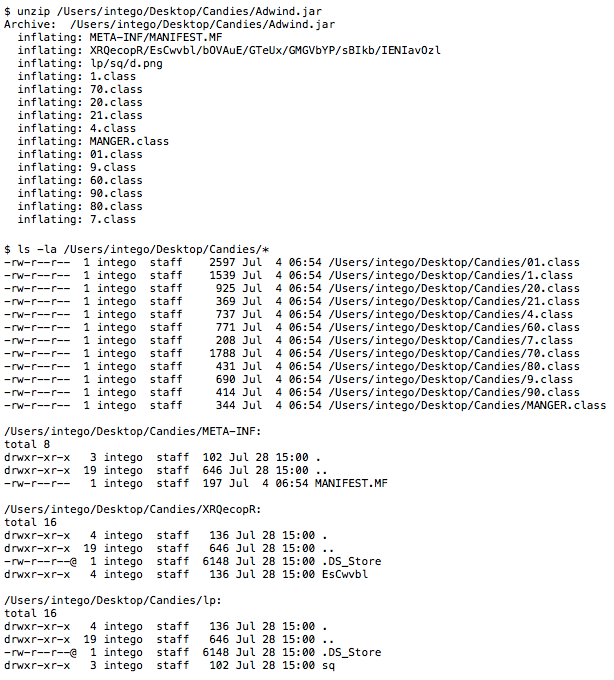 On OS X or macOS, when executing the Adwind dropper—meaning that when the rogue file is executed, it will “drop” its infection on the target—it creates a launch agent, which it uses to start a loader that is devoted to download malicious files from the Internet or connect to rogue servers.