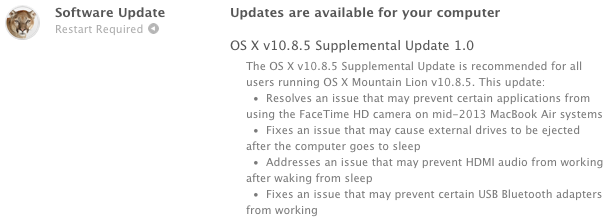 The OS X 10.8.5 Supplemental Update is recommended for all users running OS X Mountain Lion v10.8.5. You can update through Apple’s Software Update tool by choosing Apple menu > Software Update, or you can go directly to Apple’s Software Downloads page and get the update from there.