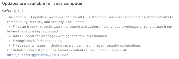 Mac users running OS X Lion systems can install the Safari 6.1.3 update by choosing Apple menu > Software Update (if prompted, enter an admin password). For users running OS X Mavericks and OS X Mountain Lion systems, Safari 6.1.3 and Safari 7.0.3 may be obtained from the Mac App Store.
