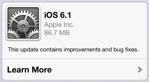 Apple has released iOS version 6.1 with an 86.7 MB software update containing more than a handful of bug fixes and other improvements. Available for the iPad 2 and later, iPhone 3GS and later, and iPod touch (4th generation) and later, this update includes several feature improvements in addition to product security: