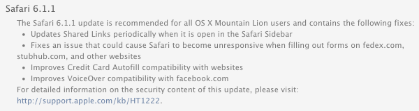 Safari 6.1.1 and Safari 7.0.1 are available for OS X Lion 10.7.5, OS X Lion Server 10.7.5, OS X Mountain Lion 10.8.5, and OS X Mavericks 10.9. Apple’s OS X 10.9.1 update includes the security content of Safari 7.0.1.
