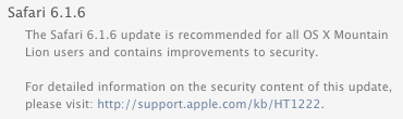 Mac users running OS X Lion systems can install the Safari 6.1.6 update by choosing Apple menu > Software Update (if prompted, enter an admin password). For users running OS X Mavericks and OS X Mountain Lion systems, Safari 7.0.6 and Safari 6.1.6 may be obtained from the Mac App Store.