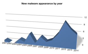 There were quite a few new samples of OS X malware that were discovered in 2014. Apple’s built-in Safe Downloads List (aka XProtect, the rudimentary unsafe-download blocker built into Snow Leopard and later) was updated 12 times throughout the year. Somewhat surprisingly, Apple has (for now) continued to release XProtect updates for Snow Leopard and Lion even though both OS X versions are no longer receiving security patches to the operating system itself. (Perhaps Apple is trying to prevent headlines about armies of Mac botnets; after all, Lion and earlier versions of OS X comprise roughly one-fifth of the Mac installed base, as I reported here.)