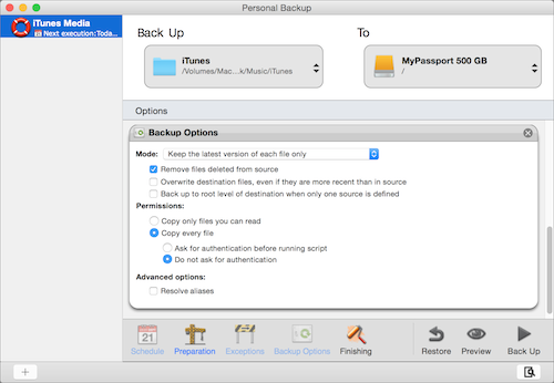 One of the most useful features in Personal Backup is the ability to only back up files that are new, or that have been updated. This first time you back up your iTunes Library, it may take a long time, but each subsequent backup will be much quicker (unless you’ve just bought a few seasons of Game of Thrones or Downton Abbey). Personal Backup scans your source folder and the destination folder, finding which files are different, and only copies them. It also removes any files no longer in the source folder, if you wish, so those rented movies that were backed up last week won’t keep taking up space after you’ve removed them from your iTunes library.