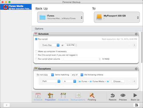 For more flexibility, you can use Intego Personal Backup. Unlike Time Machine’s (more or less) all or nothing approach, Personal Backup lets you choose exactly what you want to back up, exclude specific types of files, and set schedules.