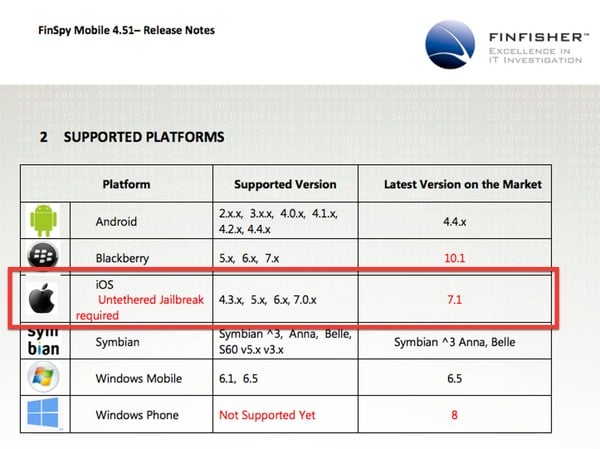 According to Gamma International sales documents leaked by the hackers, FinFisher (also known as FinSpy) has no difficulties running on Androids and Blackberrys, but if it is up against a regular, non-jailbroken iPhone – it’s powerless.