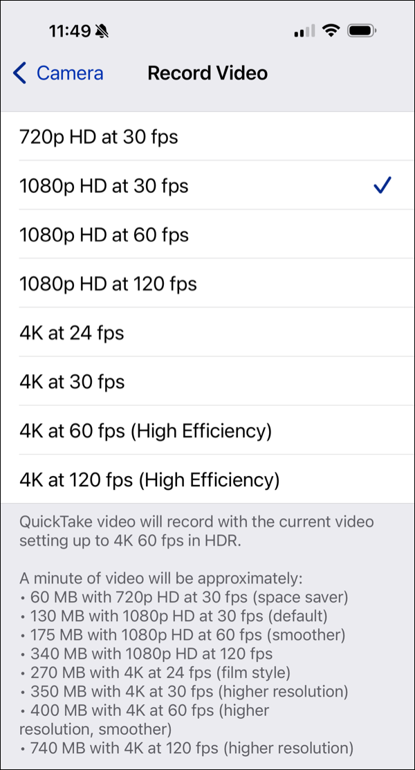 Given that iPhones and iPads can shoot videos in 4K, this storage can fill up quickly. Photos themselves are only a few megabytes, but videos can use huge amounts of storage. If you go to Settings > Camera > Record Video, you’ll see how much space each of the different formats uses per minute: