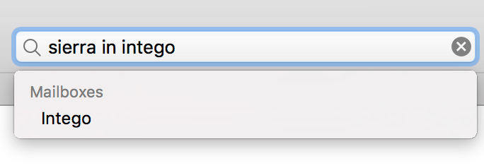 Select the mailbox prior to starting a search to limit results to that mailbox alone. If viewing one mailbox but wanting to search in another, use the construction ‘term in mailbox name’ (such as ‘Sierra in Intego’), and select the relevant mailbox name from the results list.