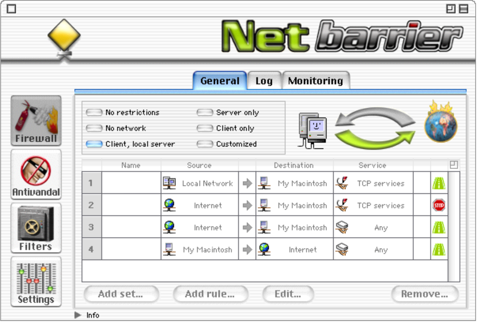 The success of Rival led Intego to continue its mission of protecting Mac users. In July 1999, Intego released NetBarrier, the first personal security software suite for Mac OS. NetBarrier combined a firewall and anti vandal to prevent network attacks, and packet filtering features to block sensitive data, such as passwords, credit card numbers, and more. NetBarrier was revolutionary for Macs; at this time, firewall software for Mac didn’t exist for consumers.