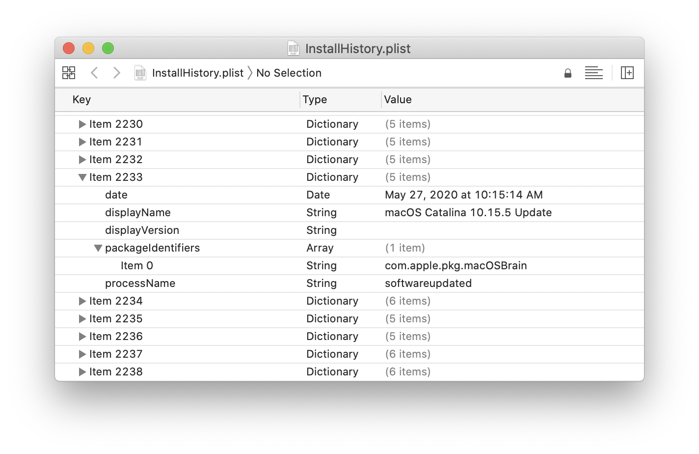 The entry closest to the bottom of the file is what was installed most recently. In the example above, this was an operating system update for macOS Catalina. As you’ll notice, there are a number of different updates in the “array” section, as different elements of macOS were updated.