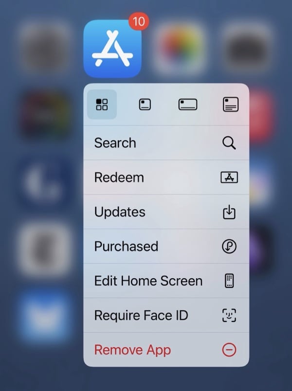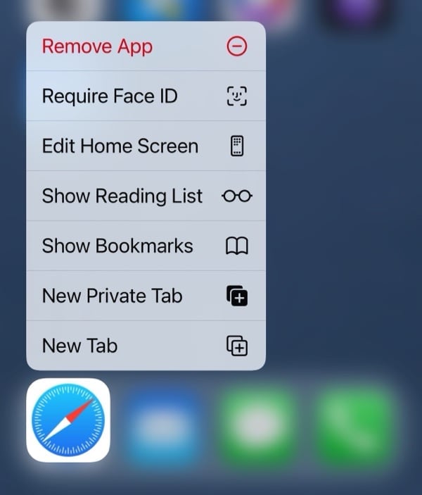 But did you know that you can also get contextual menus—similar to a right-click menu on macOS or Windows—when you press and hold app icons? Some apps only offer a limited number of options in these menus; the basics that are part of iOS and iPadOS are: Edit Home Screen, Require Face ID, and Remove App.