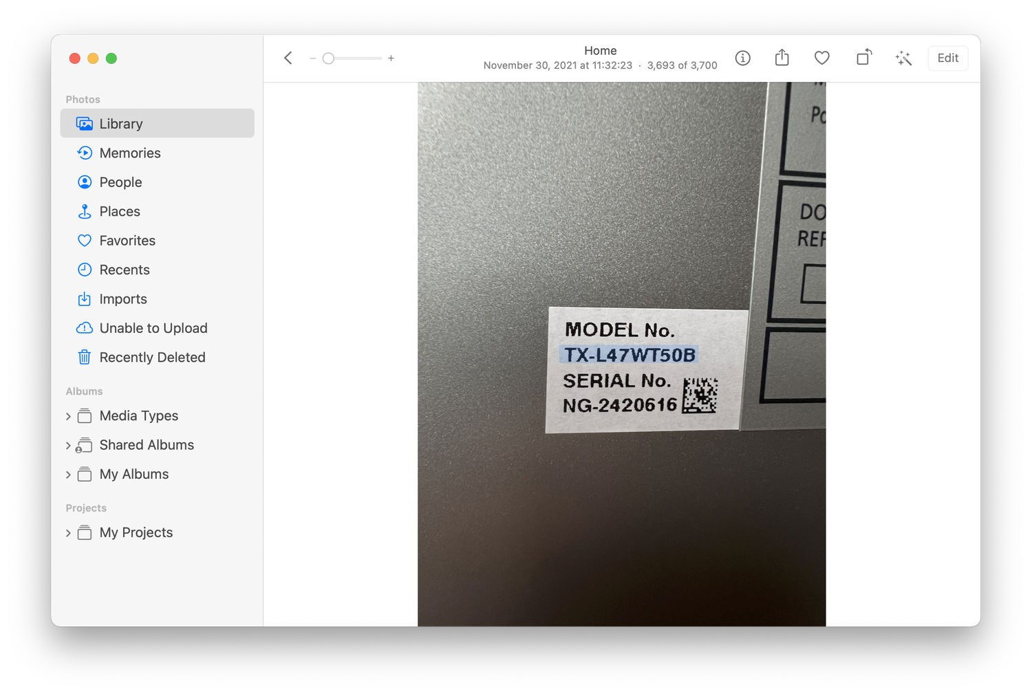 Live Text automatically scans your photos on your Mac for text. If you open the Photos app on your Mac, and find a photo which contains text – such as a sign, words on a t-shirt, or text in a screenshot – you can click that text to select it. Here’s an example: I needed to copy the model number of a TV, so I took a photo, then, back on my Mac, in the Photos app, I was able to select that text by double-clicking it.
