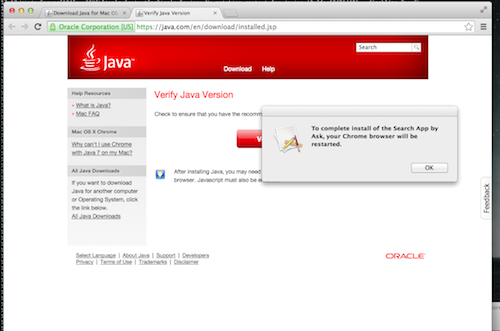 When the Java installation is complete, the Java installer redirects the user to the Java website. Chrome prompts to restart in order to complete the installation.