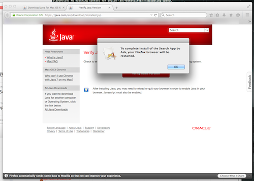 When the Java installation is complete, the Java installer redirects the user to the Java website. Firefox prompts to restart in order to finish the installation.
