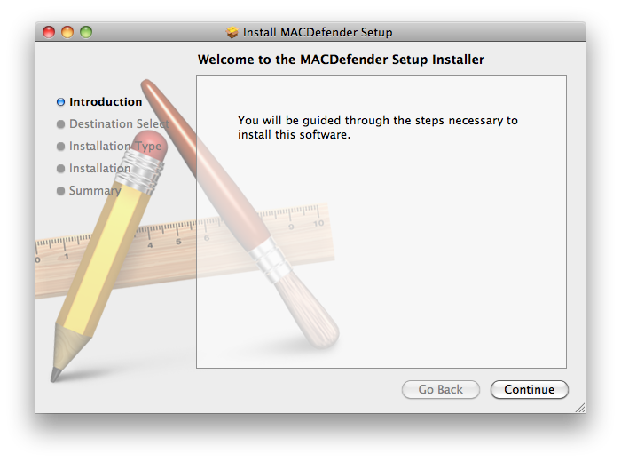 Description: Intego has discovered a fake antivirus program called MAC Defender, which targets Mac users via SEO poisoning attacks (web sites set up to take advantage of search engine optimization tricks to get malicious sites to appear at the top of search results). When a user clicks on certain links after performing a search on a search engine such as Google, they are sent to a web site that displays a fake Windows screen with an animated image showing a malware scan; a window then tells the user that their computer is infected. After this, JavaScript on the page automatically downloads a file. The file downloaded is a compressed ZIP archive, which, if a specific option in a web browser is checked (“Open ‘safe’ files after downloading” in Safari, for example), will open. The file is decompressed, and the installer it contains launches presenting a user with the following screen: