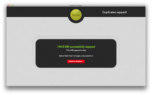 Once your duplicates have been zapped, you’ll be given a report that shows how much hard disk space you recovered, including how much disk space you’ve saved since first using Duplicate Zapper.