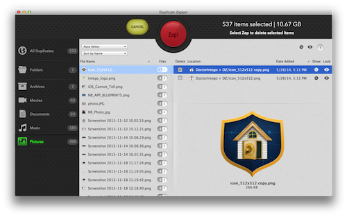 Leveraging our long history and experience developing Mac software, Duplicate Zapper has been built around user confidence and trust. It even contains safeguards to prevent the deletion of system critical files that Mac OS X or applications rely on and it deletes duplicates to the Trash Bin first for easy recovery if necessary.