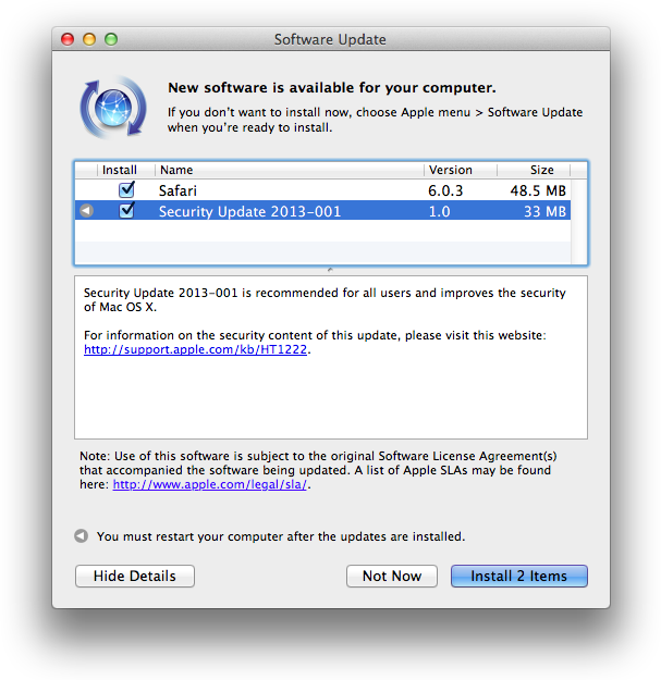 Last week, Apple released a new version of its OS X Mountain Lion operating system to Mac OS X 10.8.3. This update includes multiple bug fixes and improves the security of Mac OS X. Included with Mac OS X 10.8.3 are Safari 6.0.3 and Security Update 2013-001, both of which address multiple security problems. For Mac users running OS X Lion, the 33 MB Security Update 2013-001 shipped alongside the Safari 6.0.3 software update.