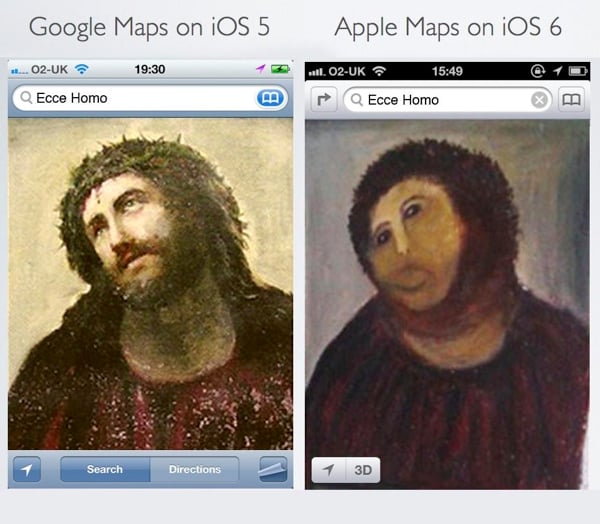 A tongue-in-cheek comparison of Google Maps vs. Apple Maps using the pre- and post-restoration of the “ecce homo” fresco in Spain (in which an elderly woman tried to “restore” it herself and ended up ruining it):