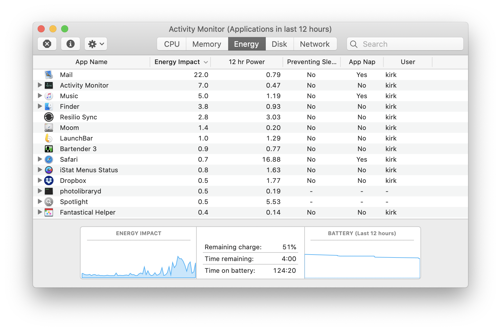 While the data shown here isn’t very precise, it can give you an idea if a specific app is using a lot of power. So if your laptop’s battery is depleting faster than you expect, have a look here. There are ways to reduce the energy usage of your Mac; see this article for some tips.
