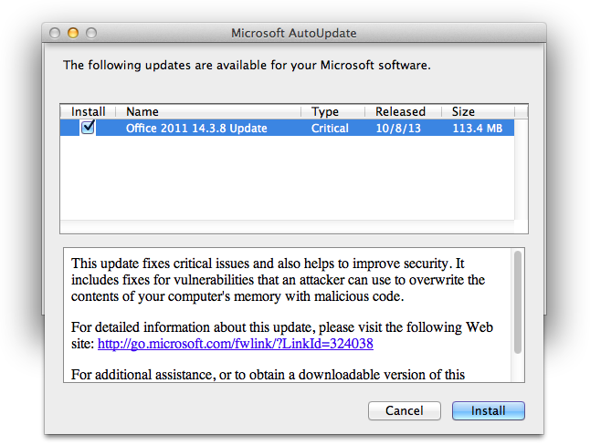 We strongly encourage all users running Office for Mac 2011 apply these updates as soon as possible. Office users can update your software using Microsoft’s AutoUpdate application, or you can visit Microsoft’s Download Center to get the 113.4 MB Office 2011 14.3.8 update for Mac.