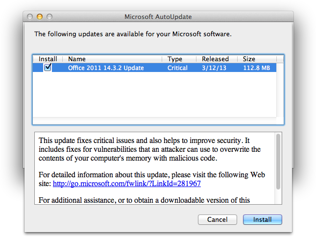Microsoft has released important security updates to Office for Mac 2011, which includes bug fixes and patches for security issues. Microsoft’s 112.8 MB software update resolves a critical flaw in Office Outlook for Mac that could allow information disclosure if a user opens a specifically crafted email message.