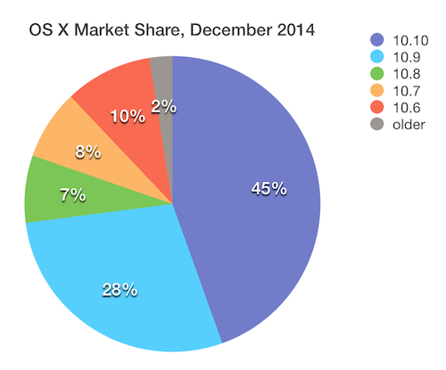 This is a significant increase over two months ago, when Yosemite had been out for less than a month, and Net Applications’ data indicated that Yosemite had nearly reached 20% of the market already by that time.