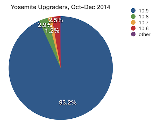 Nearly all of the gain in Yosemite’s market share came from former users of Mavericks (OS X version 10.9, which was released a year prior to Yosemite). Specifically, more than 93% of those who upgraded to Yosemite within the past two months seem to have upgraded from Mavericks (or started using a new Mac that shipped with Yosemite).