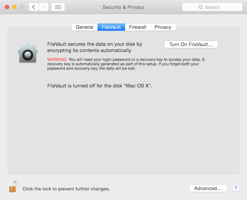 Apple’s FileVault full-disk encryption has been around for a while. If you have a laptop and travel with it, it’s a good idea to turn this on. You can do this on the FileVault pane.