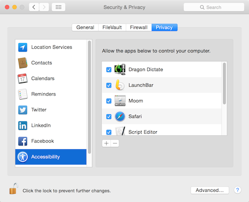 This setting helps prevent apps from issuing commands to your Mac, ensuring that no app that you download and run is doing more than you expect. Accessibility is probably not the best name for this; that is generally used for the feature set that allows you to adjust your Mac if you have visual or physical deficits. (There’s an Accessibility pane in System Preferences.)