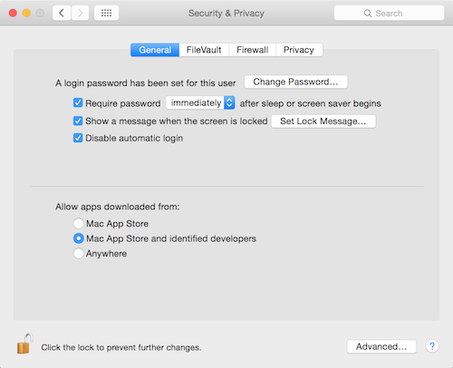 In the bottom of this pane, it’s a good idea to limit which apps can launch without special approval. You may want to limit this to Mac App Store; this would be a good idea for, say, a Mac that your kids are using. But the intermediate setting — Mac App Store and identified developers — is probably best for most users. When you try to launch an app that’s doesn’t meet these conditions, you’ll get an alert, and you can still manually approve it, but this setting prevents rogue apps from running on your Mac without you being aware.