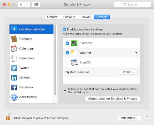The Privacy tab offers a number of options that you can set to keep your information secure. In the sidebar, you’ll see a list of items, many of them simple: Contacts, Calendars, Reminders, Twitter, Linkedin and Facebook all show which apps have requested to access this information. You’ll see alerts when apps make such requests, but you can look here from time to time to check, and revoke access if you wish. Location Services is similar. You’ll see a list of apps that have been accessing your location, and if you click Details next to System Services, you’ll be able to choose whether or not to allow Spotlight Suggestions to access your location.