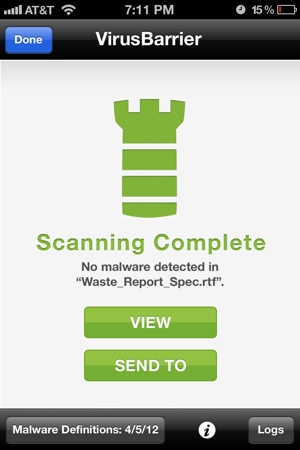 Once you receive an email attachment, you can choose to open it with Intego VirusBarrier iOS. If the scan comes up clean, our integrated file reader will open the document for quick and easy viewing, or you can send the file to a remote location such as Dropbox for storage.