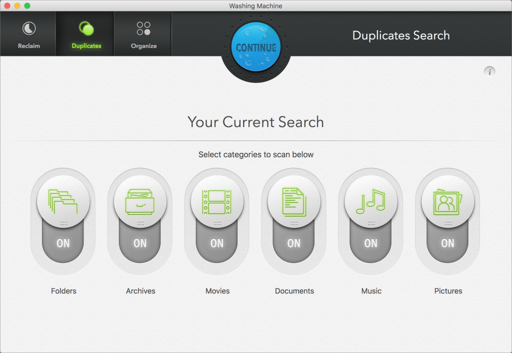 Mac Washing Machine is easy to use: Launch the app, click Duplicates, and then click the big blue button. You can also choose to only search for certain file types—which is useful if you know you have certain duplicates—and then select a specific location to search, such as your home folder, or your entire drive, and even exclude folders you don’t want to search.
