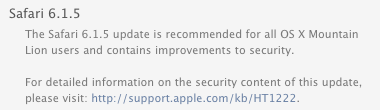 Mac users running OS X Lion systems can install the Safari 6.1.5 update by choosing Apple menu > Software Update (if prompted, enter an admin password). For users running OS X Mavericks and OS X Mountain Lion systems, Safari 7.0.5 and Safari 6.1.5 may be obtained from the Mac App Store.