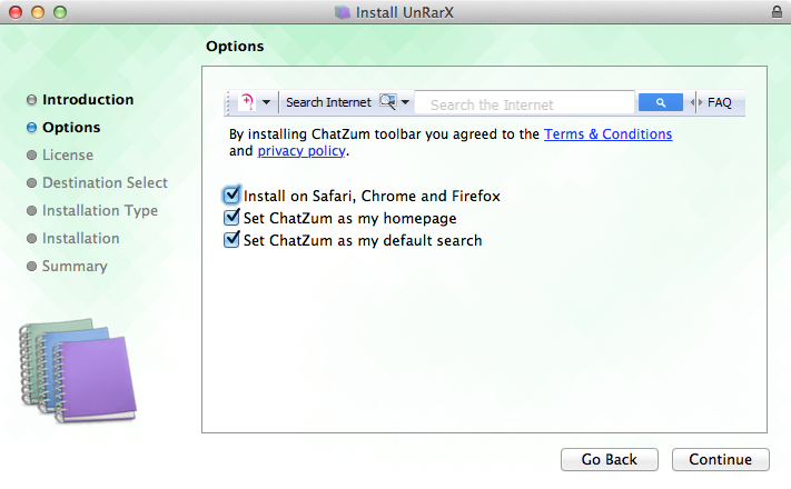 These packages purported to install a toolbar that is related to ChatZum. Even if the user declined the offer to install the toolbar, the package would silently install an Internet plug-in called Zako, and would change the browser’s search option to point to ChatZum’s site.