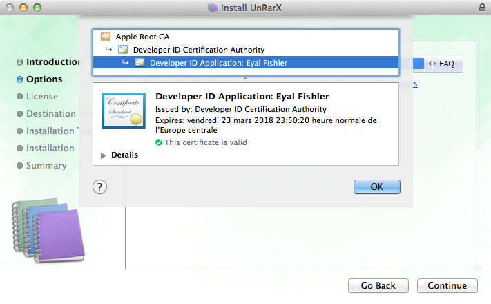 It is important to note that valid UnRarX and VLC packages do not try to surreptitiously install adware. The fake package is signed with a certificate that does not pertain to either software company.