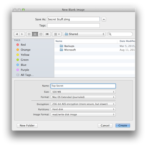 If you just want to create an encrypted, portable disk image that you only plan to use on Macs, you can do that with Apple’s Disk Utility application, which is also part of OS X. You can find it by opening Macintosh HD, then the Applications folder, then the Utilities folder (or simply click on the Spotlight magnifying glass in the upper-right corner of your screen and start typing Disk Utility). We’ve previously explained how to make an encrypted disk image from an existing folder, but you may not know that you can also create a new disk image of just about any size by clicking on the File menu, selecting New and then Blank Disk Image…, and then selecting the disk size, encryption format, and other options, as seen in this screenshot: