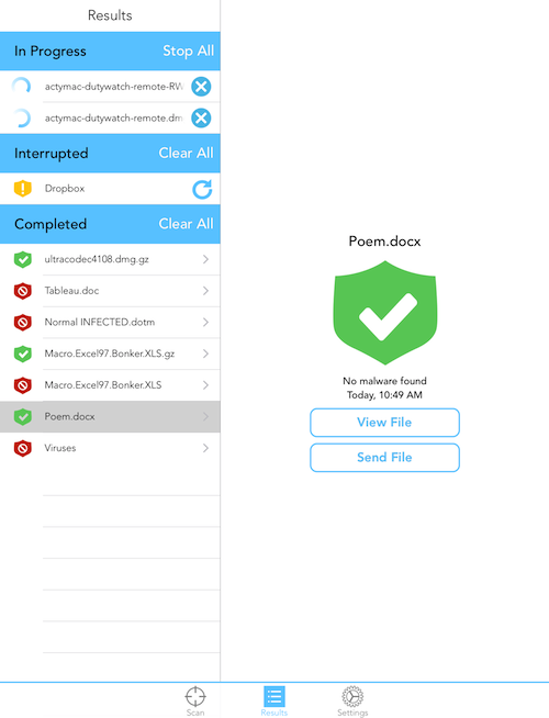 *All scans must be done manually; automatic scans or real time scanning are not possible due to Apple restrictions. You may scan entire cloud drives and websites, but email attachments must be scanned individually.