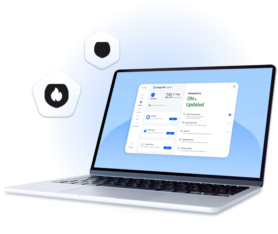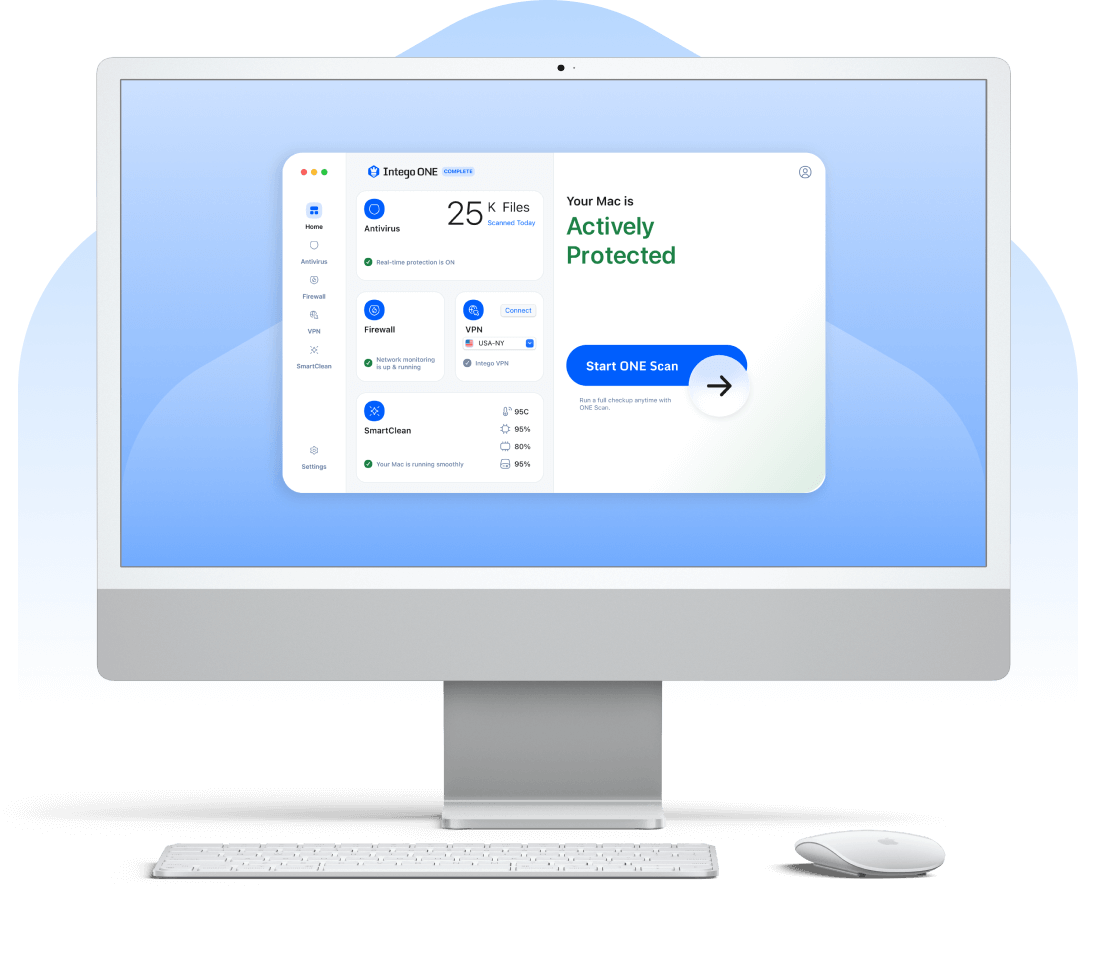 Intego ONE is built for macOS, giving your Mac real-time antivirus, firewall, VPN, and optimization tools in one sleek app.
