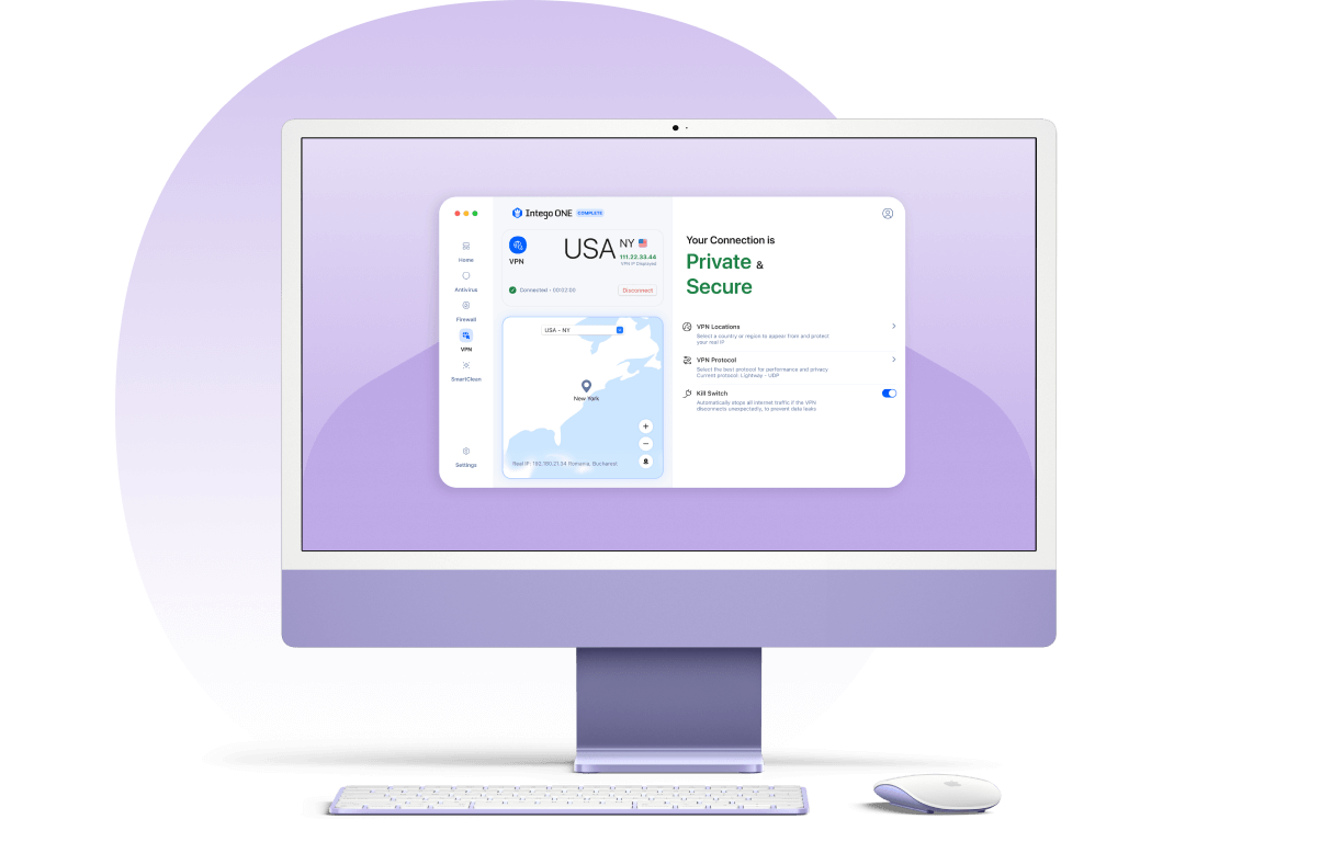 Intego VPN encrypts your internet activity and hides your location from hackers, trackers, and your ISP.